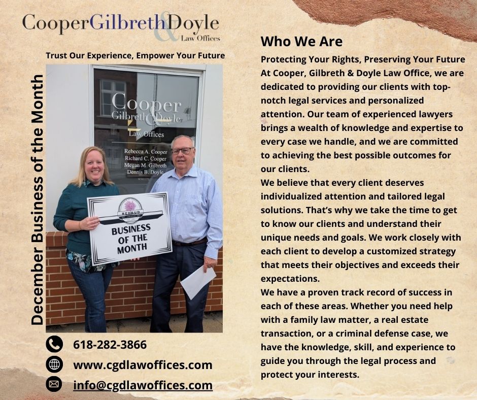 Please help us congratulate Rebecca and Richard Cooper of Cooper Gilbreth and Doyle Law Offices. Red Bud Chamber, December Business of the Month