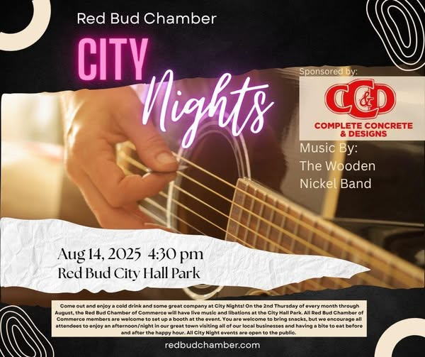 City Nights Home / Events / This event has ended Date August 14, 2025 Time 4:30 pm - 7:00 pm Red Bud City Hall 200 E Market Street Red Bud, IL 62278