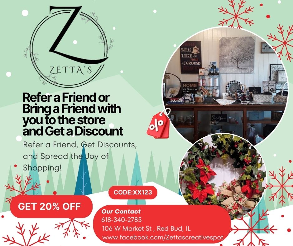 Get your friends together for some holiday shopping in Red Bud. Zetta’s is offering a 20% discount to everyone who brings their friends in this weekend for any item that is not already discounted. Use the code below. Home / News /